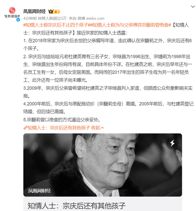 令人没有想到的是,就在大家关注这场争产大战时,更多的猛料被曝出来了,大众再次被惊掉了下巴,谁能想到宗庆后不止4个孩子,他一共有7个孩子。