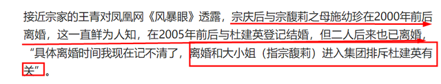 至于离婚原因,知情人称与宗馥莉进入集团排斥杜建英有关。