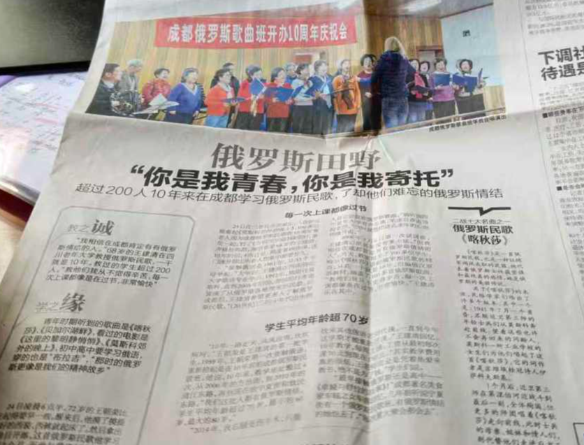 ▲学员珍藏的《成都商报》在俄罗斯民歌班10周年报道